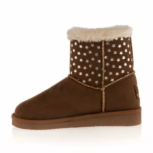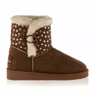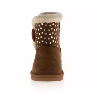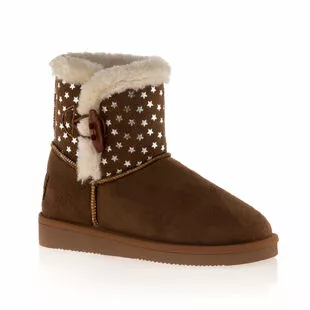 Attachées par un bouton brandebourg rappelant le manteau caban, cette paire de boots fourrées d’hiver cognac nous plonge dans un univers mode ultra réconfortant. On adore aussi leur adorable motif étoilé et leurs liserés dorés. Le nouveau basique indispensable des journées froides de la saison !
