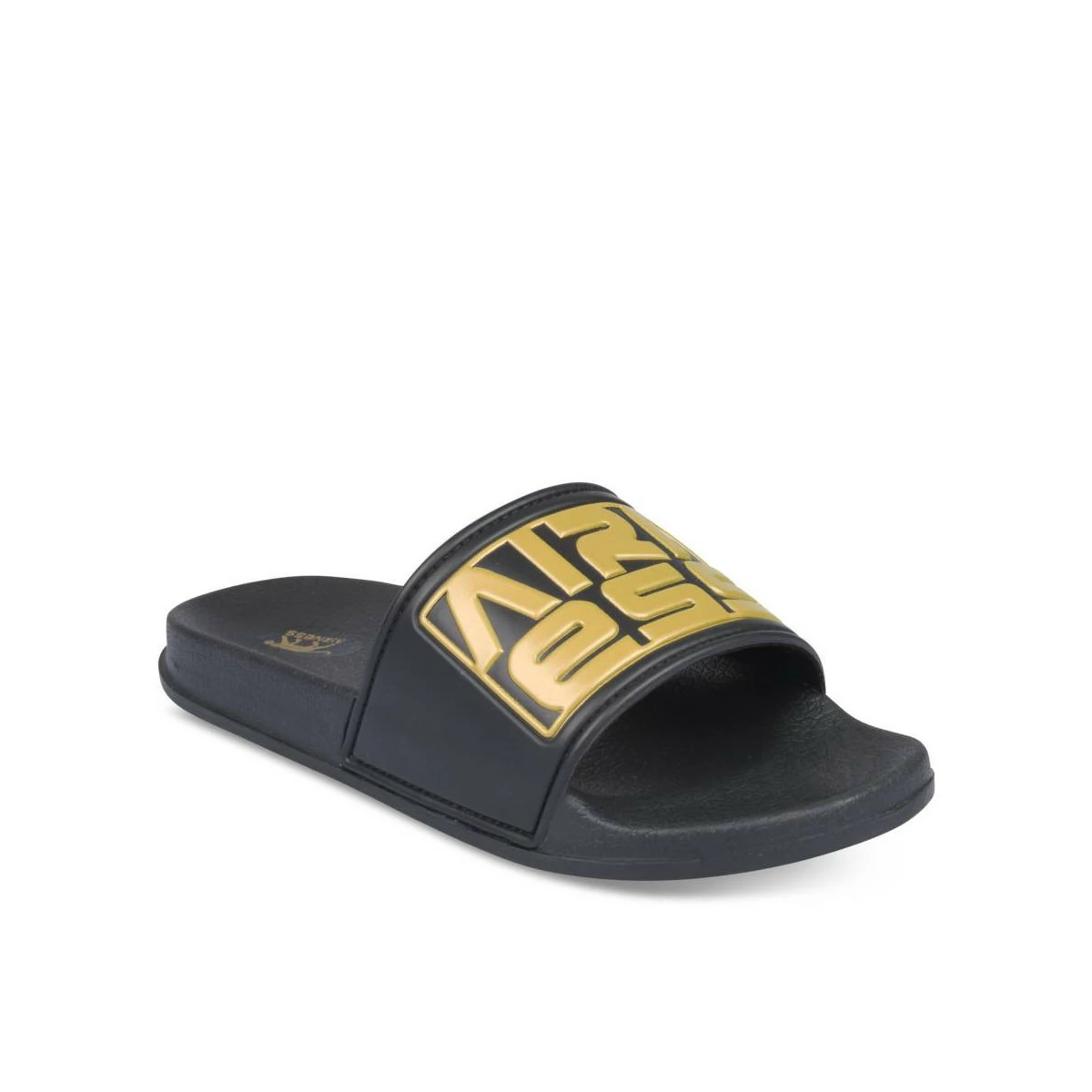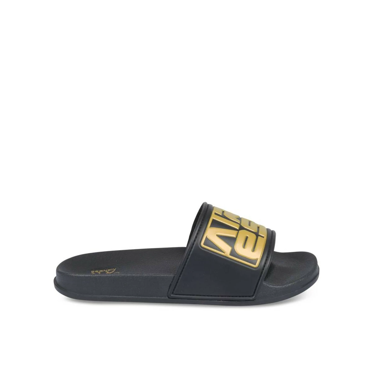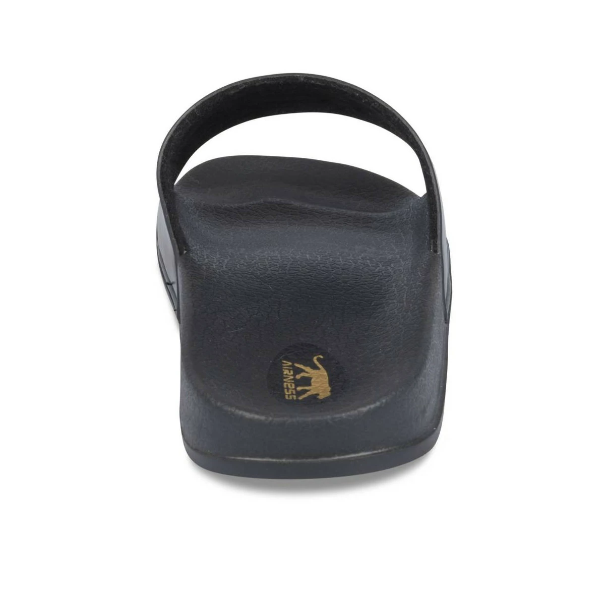 Lorsque l’été arrive, la mule de piscine est notre meilleure alliée ! Ce modèle noir de la marque Airness est doté d’une large inscription dorée rappelant le nom de la marque. On apprécie sa semelle épaisse et incurvée qui assure un bon amorti à chaque pas. Une claquette à porter sans modération au bord de la piscine !