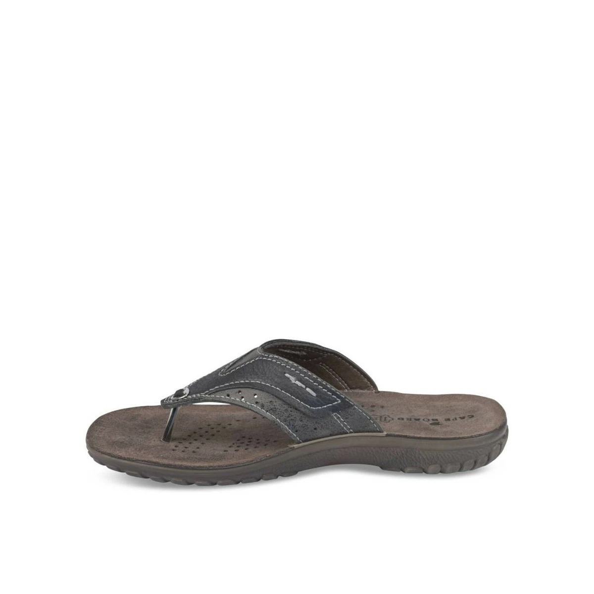 En été, aérez vos pieds en portant cette tong noire en simili cuir ! Sa semelle intérieure en cuir véritable procure une respirabilité idéale. La bride triangle à entredoigt est travaillée : surpiqûres, empiècements, perforations et jeux de couleurs. Facile et pratique à enfiler, cette tong est votre meilleure alliée de la saison estivale !